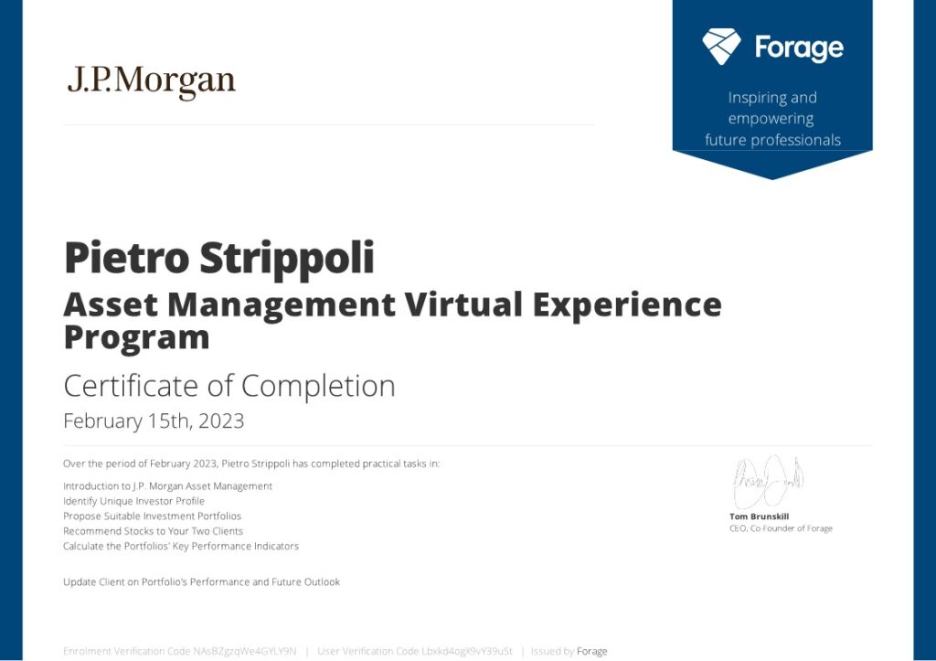Parallelamente agli studi universitari il conseguimento delle certificazioni Bloomberg Market Concepts (BMC), Environmental, Social, and Governance by Bloomberg (ESG) e la virtual experience di J.P. Morgan sull’Asset Management mi hanno permesso di approfondire le dinamiche dei mercati finanziari globali e l’importanza dei criteri di sostenibilità nelle scelte di investimento.